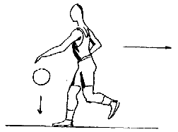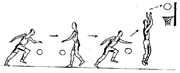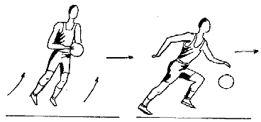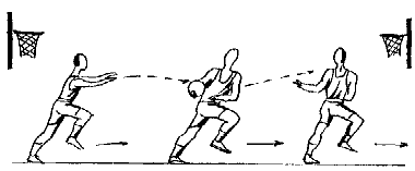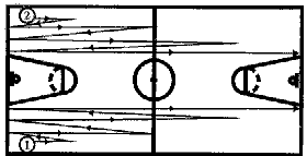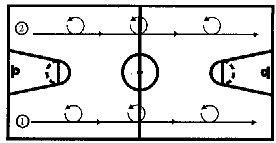 26. Скоростное ведение мяча от лицевой до штрафной линии, возвращение к щиту с забрасыванием мяча в кольцо. Затем ведение до центра и обратно, до противоположной штрафной и обратно. Проводится как соревнование двух игроков.