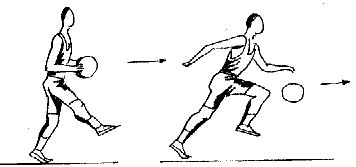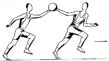 15. Быстрый бег с высокого старта с передачей мяча с руки на руку. Проводится как соревнование двух-трех игроков на время. Дистанция - до 50 м.