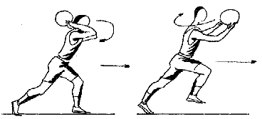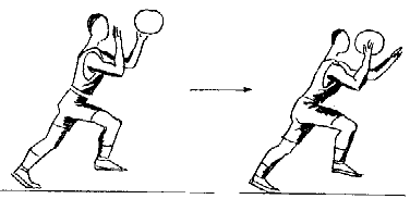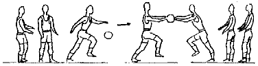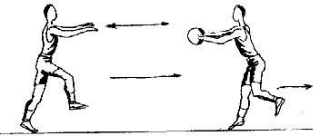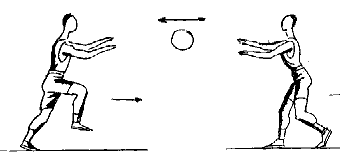 19. Скоростной бег приставными шагами двух игроков лицом друг к другу, удерживающих два мяча на вытянутых руках. Дистанция -до 50м.
