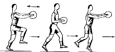 2. Быстрые шаги вперед, назад, влево, вправо с отягощением 25-30 кг-от 30 с до 1 мин (по 2-3 шага).