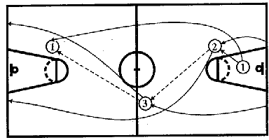 25. Скоростные передачи мяча тремя игроками в три паса с броском мяча в кольцо 5-7 раз подряд.