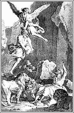 1) "Даниил, брошенный в ров ко львам" (Дан. 14, 36). Апокрифическая версия истории пророка Даниила, по которой Даниил оказался во рву с семью голодными львами за то, что умертвил священного дракона вавилонян. Ангел принес в ров пророка Аввакума с пищей в сосуде, держа его за волосы. Оставив обед Даниилу, Аввакум был возвращен обратно, а Даниила через семь дней освободили. Этот сюжет был распространен в эпоху cредневековья и в XVII веке, реже – в искусстве Ренессанса 9 . Марилье представляет сюжет достаточно схематично: на фоне условной стены рва, имитирующей ущелье, две падающие фигуры в коротких туниках, радостно приветствуемые бородатым Даниилом в чалме, халате с кушаком и в античных сандалиях, окруженным тремя добродушными львами.