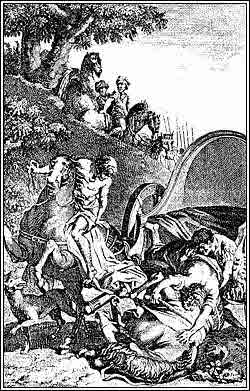 2) "Антиох поражен неизлечимой язвой" (2 Мак. 9,7). Апокрифический сюжет Ветхого завета. Сирийский царь, Антиох IV Епифан, известный ограблением иерусалимского храма и преследованиями иудеев, возвращался с войском из Персии; торопясь в Иерусалим, он постоянно подгонял возницу, правящего колесницей, но вдруг его настиг приступ мучительной боли в животе, и он упал, покалечившись. В страдании и раскаянии Антиох умирает, не достигнув Иерусалима. Зигзагообразная композиция Марилье придает изображению дина- мичность, несмотря на скульптурную застылость лошади с атлетической фигурой возницы и бегущей рядом собакой. Колесница на первый взгляд археологически точна, однако оказывается запряженной на манер экипажа. Поддерживающий задрапированную фигуру Антиоха воин одет в римские доспехи, отдаленно напоминающие испанский костюм конца XVI века.