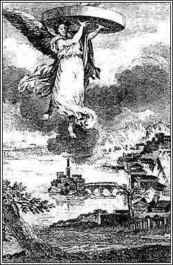 3) "Ужас тем, кто торговал с Вавилоном" (Откр. 18, 21). Новозаветный сюжет из Апокалипсиса Иоанна Богослова. Входил в 11-й том Библии Марилье 10 . Гравюра изображает символически падение Вавилона: "И один сильный ангел взял камень, подобный большому жернову, и поверг в море, говоря: "С таким стремлением повержен будет Вавилон, великий город, и уже не будет его"".