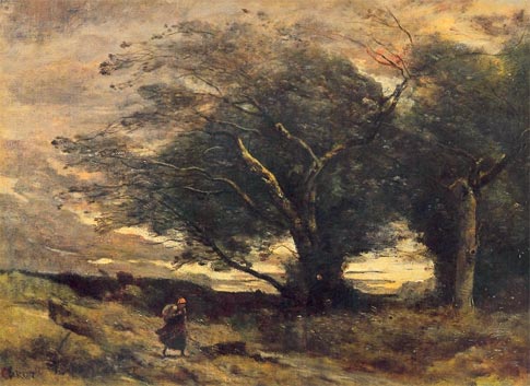 Коро умел слушать звуки природы – шум водопада, пение птиц. Вечерний пейзаж в его представлении порой ассоциировался с симфонией, а при виде приморской долины он мог воскликнуть: «Какая гармония, какое величие! Как будто это создано Глюком». Живописец любил изображать сцены, связанные с музыкой, а темы некоторых его картин навеяны сюжетами опер. Музыкальность присуща многим произведениям Коро. Она в его изобразительном языке – плавной певучести линий, ритмике повторов и контрастов, нюансировке валеров. Но если некоторые работы живописца близки жанру музыкальной пасторали, то «Порыв ветра» – полотно, насыщенное напряженным драматизмом, подобно симфониям Бетховена, одного из любимых композиторов художника. На фоне закатного неба с разорванными тучами – силуэты вековых деревьев, ветви сгибаются под мощным порывом ветра. Крестьянка спешит укрыться от непогоды. Все полно движения, порыва. Более пастозно, чем обычно, наложены краски, манера письма экспрессивна. Мы не только ощущаем напор воздушных масс, но почти слышим шум ветра. Кисть художника превращает обычную жанровую сцену в произведение, исполненное философского смысла, где человек противостоит силам разбушевавшихся стихий.