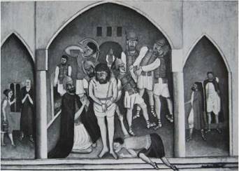Второй блок произведений Трильхаза связан с воплощением новозаветных сюжетов, в которых основной акцент ставится на христологическом цикле. Доминирующий образ Иисуса Христа вновь обращает внимание на аспект самоидентификации создателя картины. Избранный персонаж посланника Бога как будто срастается с мироощущением художника. Тот же насыщенный колорит воплощается в сюжете «Отрок Иисус в храме среди своих учителей», жизненно драматические образы запечатлены в графических листах «Отдых у реки», «Голова Христа», «Пригвождение к кресту». Драматизм, иносказательность, метафоричность — все эти стороны художественного языка Трильхаза свидетельствуют о зарождении характерной традиции наивного искусства Германии, или «библейской линии». К примеру, многофигурная сцена в «Проповеди у реки» («Проповеди Иисуса у моря Галилейского») в большей мере строится на передаче экспрессивных образов, незаметно перерастающих в единое тело, изголовьем которого становится тело Христа. Пронизывающе трогательным циклом Трильхаза можно считать интерпретацию страстей Господних, где тему мученичества, жертвенности с невероятной силой подчеркивает нарастающий драматизм значимого религиозного события. Начиная со сцены «Входа в Иерусалим», также «Голова Христа» (ил. 4), «Поругание Христа» (ил. 5), «Христа пригвождают к кресту» и вплоть до «Воскрешения Христа», «Мучения первых христиан» — все эти сюжеты определенным образом выявляют неоднозначный взгляд автора на происходящие события в политической жизни Германии. То было время расцвета столь ненавистной многим Веймарской республики, когда национальный дух народа был низвергнут, распят, как великий мученик. Лишь скрытым (аллегорическим) языком можно было передать мрачные настроения на рода. Убедительное возрождение немецкой нации, обретение ею истинного лица выражается наиболее полно в работах «Добрый самаритянин», «Апостол Петр проповедует иудеям». Иными словами, речь идет, в отличие от предыдущих работ, о более оптимистическом настрое Трильхаза относительно будущего Германии.