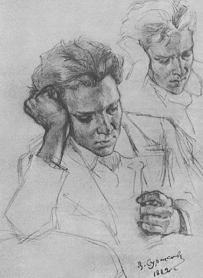 В. Суриков. «Юноша за столом». Карандаш. 1882.