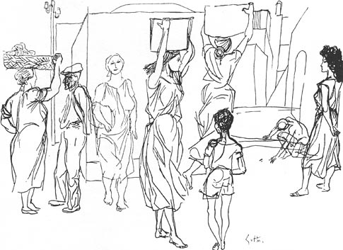 Р. Гуттузо. «Рынок в Анакапри». Перо. 1954.
