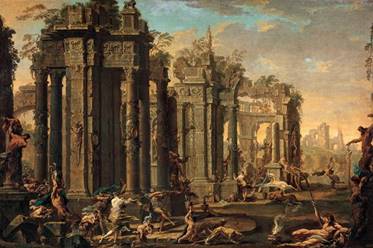 Необходимо обратить внимание на то, что действие происходит на фоне руин величественных древнеримских сооружений. И эти руины, и вакханалия на их фоне вместе выявляют более глубокую мысль художника. Изображён не просто языческий праздник в честь бога Вакха, а образ жизни древнеримского общества, погрязшего в пороках и разврате и представлявшего сплошную вакханалию. Этот образ жизни и привёл римскую империю к разрушению и гибели.