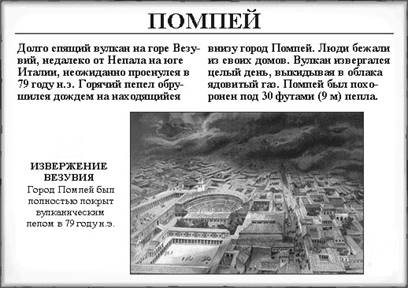 Частково зовнішній вигляд римського міста можна уявити на прикладі Помпеї – італійського міста, що разом з містами Геркуланум і Стабія загинув у 79р. н.е. у результаті виверження вулкану Везувій. Поховане під попелом місто випадково знайшли при будівництві водопроводу у XVІІ ст. З 1748 р. До наших днів продовжуються його розкопки. Місто мало регулярне планування. Прямі вулиці обрамлялися фасадами будинків, унизу яких були улаштовані лавки-таверни. Великий форум був обнесений прекрасною двоповерховою колонадою. Там знаходилися святилище Ісиди, храм Аполлона, храм Юпітера, великий амфітеатр, побудований, як і в греків, у природному поглибленні. Розрахований на двадцять тисяч глядачів, він значно перевершував потреби жителів міста і призначався також для приїжджих (населення Помпеї складало не більш десяти тисяч чоловік). У місті було два театри.