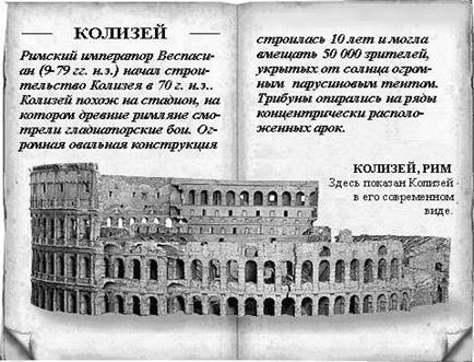 Колізей – найбільший амфітеатр античної епохи. Він уміщав біля п’ятдесятьох тисяч глядачів. Могутні стіни Колізею (висота 48,5м) розділені на чотири яруси суцільними аркадами, у нижньому поверсі вони служили для входу і виходу. У плані Колізей являє собою еліпс (156X198м); центр його композиції – нині зруйнована арена, оточена східчастими лавами для глядачів. Еліпс найбільш повно відповідав вимогам динаміки видовищ, що розгортаються – гладіаторських боїв. Він давав можливість максимально активізувати глядача, наблизити місця привілейованої публіки до арени; що спускалися лійкою, розділялися відповідно до суспільного рангу глядачів. Усередині йшли чотири яруси сидінь, яким зовні відповідали три яруси аркад: дорична, іонічна і коринфська. Четвертий ярус був глухим, з коринфськими пілястрами – плоскими виступами на стіні. Пілястри, що членують стіну, коринфського ордера не порушують моноліт будинку, викладеного із сірого травертину.