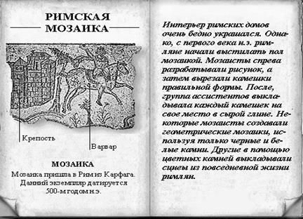 Древній Рим дав людству справжнє культурне середовище: прекрасно сплановані, зручні для життя міста з брукованими дорогами, мостами, будинками бібліотек, архівів, німфеєв (святилищ, священних німфам), палаців, вілл і просто гарних будинків з добротними красивими меблями – усе те, що характерно для цивілізованого суспільства.