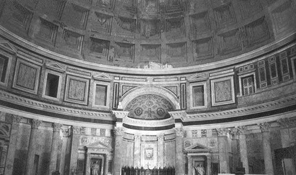 І ще один великий винахід римлян – купол. Хоча ми вже бачили купольні будівлі в егейській і етруській архітектурі, але справжній купол змогли створити тільки римляни. У досконалості опанувавши мистецтвом кладки арок і зведення зводів, римляни створили купол, що виявився логічним завершенням розвитку цих конструкцій. Купол, як безліч арок, перекинутих через одну точку – замок-купола, – у всієї своїй вроді з'являється перед нами у великому римському спорудженні епохи імператора Адріана в Пантеоні, побудованому в 117-138 роках і присвяченому семи головним римським богам.