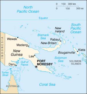 В восточной части острова Новая Гвинея, на архипелаге Бисмарка и северной части Соломоновых островов расположено государство Папуа — Новая Гвинея. В XVI в. эти земли были открыты португальцами. С 1884 г. территорией владели Великобритания и Германия, а в начале XX в. она контролировалась Австралией. Хотя в 1975 г. страна стала независимой, она входит в Содружество и формальной главой государства является королева Великобритании. В стране добывают медь, золото и цинк. Выращивают кофе, какао и кокосовую пальму.