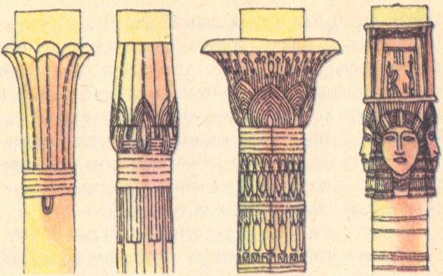 Капители колонн: пальмовидная, папирусообразная с закрытым бутоном цветка, папирусообразная с распустившимся цветком, в виде головы богини Хатор
