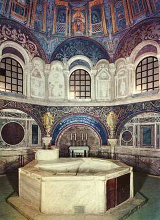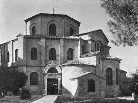 Церкви в Эсре, Юж. Сирия, 515 г., Сергия и Вакха в Константинополе, ок. 526—527 г., Сан-Витале в Равенне, 526—547 г. представляют собой центрическую композицию на восьми устоях, основа которой — сильно развитое подкупольное пространство. Ступенчатая структура и богатая пластика образованы в основном конструктивными элементами:
