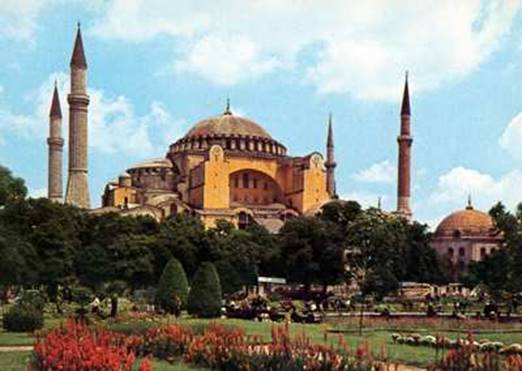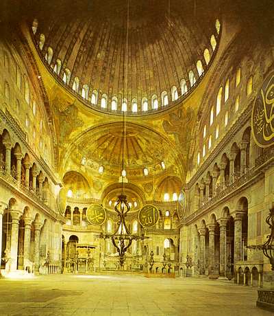 Вершиной развития арочно-сводчатых структур явилась грандиозная купольная базилика собора Софии в Константинополе построенная греческими архитекторами Анфимием из Тралл и Исидо-ром из Милета в 532—537 гг., в правление императора Юстиниана.