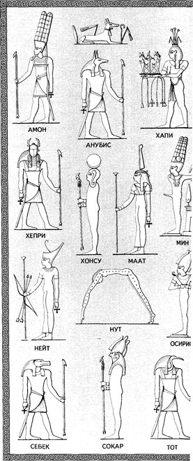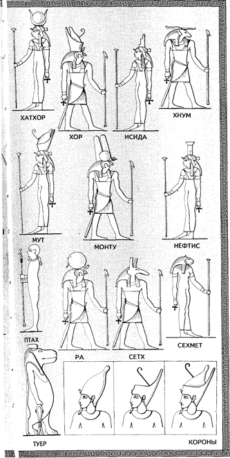 Птах был главным богом Мемфиса; он обыкновенно изображался в виде мумии с обритой головой. Он назывался богом "с красивым лицом, богом, придающим новую жизнь или новые формы". Птах есть то божество, которое снабдило бога Ра, сотворившего Вселенную, всеми элементами, из которых составился мир. Он часто изображается с символом воскресения на голове - это скарабей, или навозный жук, - и попирает ногами крокодила, символ мрака. Амон является высшим божеством Фив; греки отождествляли его с Юпитером. Он главный деятель в природе и главная причина, заставляющая природу вечно возобновляться. Так как для Египта высшее проявление могущества этого бога заключалось в размножении стад, то Амон чаще всего изображался в виде барана, и вот почему в Фивах к храмам, посвященным этому богу, вели дорожки, украшенные по обеим сторонам бараньими головами. Это животное было ему посвящено и - чаще всего приносилось ему в жертву.
