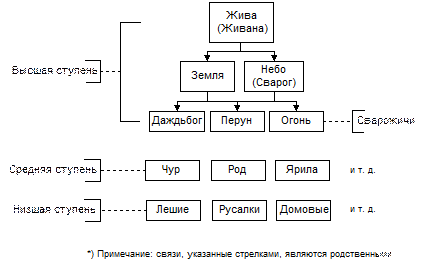 На высшем уровне располагались Боги, чьи "функции" были наиболее важны для славян и которые участвовали в самых распространенных сказаниях и мифах. Это Сварог (Стрибог, Небо), Земля, Сварожичи (дети Сварога и Земли - Перун, Даждьбог и Огонь).