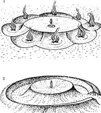цветка; в тех святилищах, что раскопаны археологами, "лепестков" обычно восемь, но в древнейшие времена, по мнению учёных, их было шесть. "Лепестки" представляли собой ямы, в которых горели неугасимые священные костры. Посередине ставилось скульптурное изображение Бога. Иногда говорят, что древние славяне верили в идолов. Но это всё равно что утверждать, будто христиане верят в иконы. Перед изображением Бога помещался алтарь, обычно в виде каменного кольца. Туда складывали приношения, проливали жертвенную кровь: чаще всего — животную, а