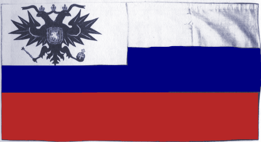 i Вот описание русского флага начала XVIII в.: «Флаг Его Царского Величества московского разделен натрое. Верхняя полоса белая, средняя синяя, нижняя красная. На синей полосе золотой с царской коруною венчан двоеглавой орел, имеющий в сердце красное клеймо с серебряным св. Георгием, без змия». Торговым флагом в 1б93-1700гг. считался белый с двуглавым черным орлом.