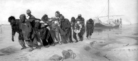 «Перед Вами широкая, бесконечно раскинувшаяся Волга, словно млеющая и заснувшая под палящим июльским солнцем. Где-то вдали мелькает дымящийся пароход, ближе золотится парус бедного судёнышка, а впереди, тяжело ступая по мокрым отмелям и отпечатывая следы своих лаптей на сыром песке, идёт ватага бурлаков. Запрягшись в свои лямки и натягивая постромки длинной бичевы, идут в шаг эти одиннадцать человек, живая машина возовая, наклонив тела вперёд и в такт раскачиваясь внутри своего хомута. Нет ни одной цельной рубахи на этих пожжёных солнцем плечах, ни одной цельной шапки и картуза - всюду дыры и лохмотья, всюду онучи и тряпьё...