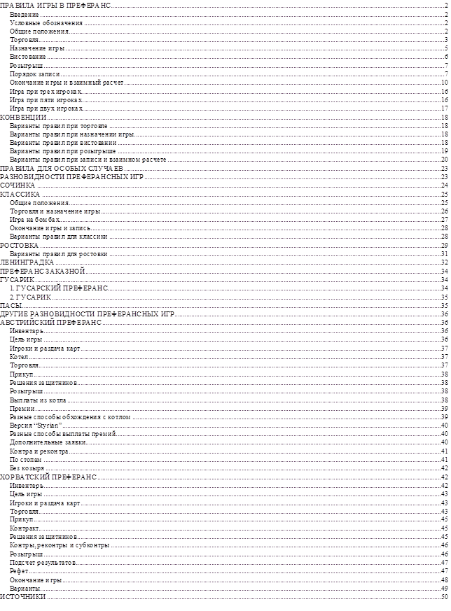 Правила игры в преферанс довольно сложны, поскольку после каждой раздачи карт могут возникнуть разные типы розыгрыша. Сложность преферансного кодекса усугубляется еще и тем обстоятельством, что, кроме общих, единых положений, существуют еще условия, о которых игроки специально договариваются между собой перед началом игры. Речь идет не о каких-то принципиальных изменениях, а лишь о выборе одного из нескольких имеющихся в практике мирового преферанса вариантов розыгрыша какой-нибудь ситуации или вариантов записи и подсчета очков. Эти варианты бывают подогнаны один к другому, и тогда они составляют как бы отдельный вид преферанса, обладающий даже своим собственным именем.