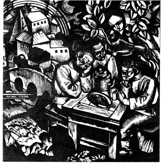 Одна из самых больших гравюр Купреянова так и осталась незаконченной – «Трое за столом. Пейзаж с радугой»,- наделена особенно сложной символикой, о смысле которой мы только можем догадываться.