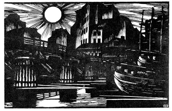 В другой гравюре тех лет – «Город с солнцем» - солнечный диск, повисший над городом, знаменует восход солнца, словно чуда первого дня творенья – преодоления тьмы, хаоса, отделения света от тьмы. Уже в самом названии указан поэтический смысл образов. Сейчас эта символика кажется замысловатой, но в своё время она была общепонятной.