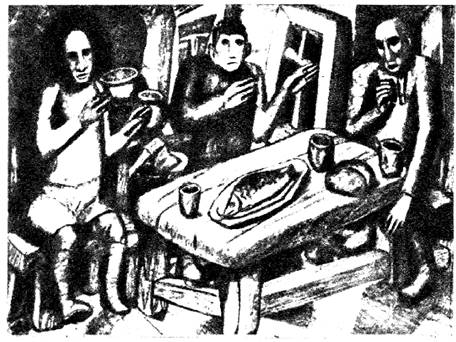 На первом плане сцена трапезы – некий вариант ветхозаветной троицы. Мужиковатые, кряжистые, как будто вырезанные из целого куска дерева, фигуры странников мало похожи на библейские персонажи: в них что-то простодушное от первых купреяновских гравюр. Трапеза изображена в ракурсе и сдвинута в правый край. За спиной левого странника развёрнут городской пейзаж: по выгнутому дугой мосту с тремя (повторение темы троичности) чёрными арками в сторону пустынного города тянется чёрная пустая телега (как «чёрная телега» с мёртвыми телами у Пушкина в «Пире во время чумы»). На мосту – булыжная кладка (как в «Битюге»). Сама трапеза не строго канонична, а приобретает оттенок жанра. Грубо сколоченный стол, на нём – в тарелке рыба. Присутствующая здесь как символ Христа, но рядом – современная деталь – большой чайник; у стола слева – большое чёрное пятно, очень напоминающее кошку своим силуэтом: в русском фольклоре кошка олицетворяла домового. Над странниками, подобно Богоматери, склонилась женщина с ребёнком. Женщина здесь, подобна радуге, поднявшаяся над этим городом мёртвых, символизирует жизнь и просветление. Тема трапезы – тема символа духовного единения, готовности к самопожертвованию – сохранила свой высокий смысл, хотя сильно упрощена и сближена с реальностью. Но эта тема ещё долго будет в гравюрах Купреянова символизировать патриархальный уклад домашней семейной жизни. Смысл гравюры проступает в контексте полубиблейских, полу литературных интерпретаций, окрашенных драматизмом своего времени.