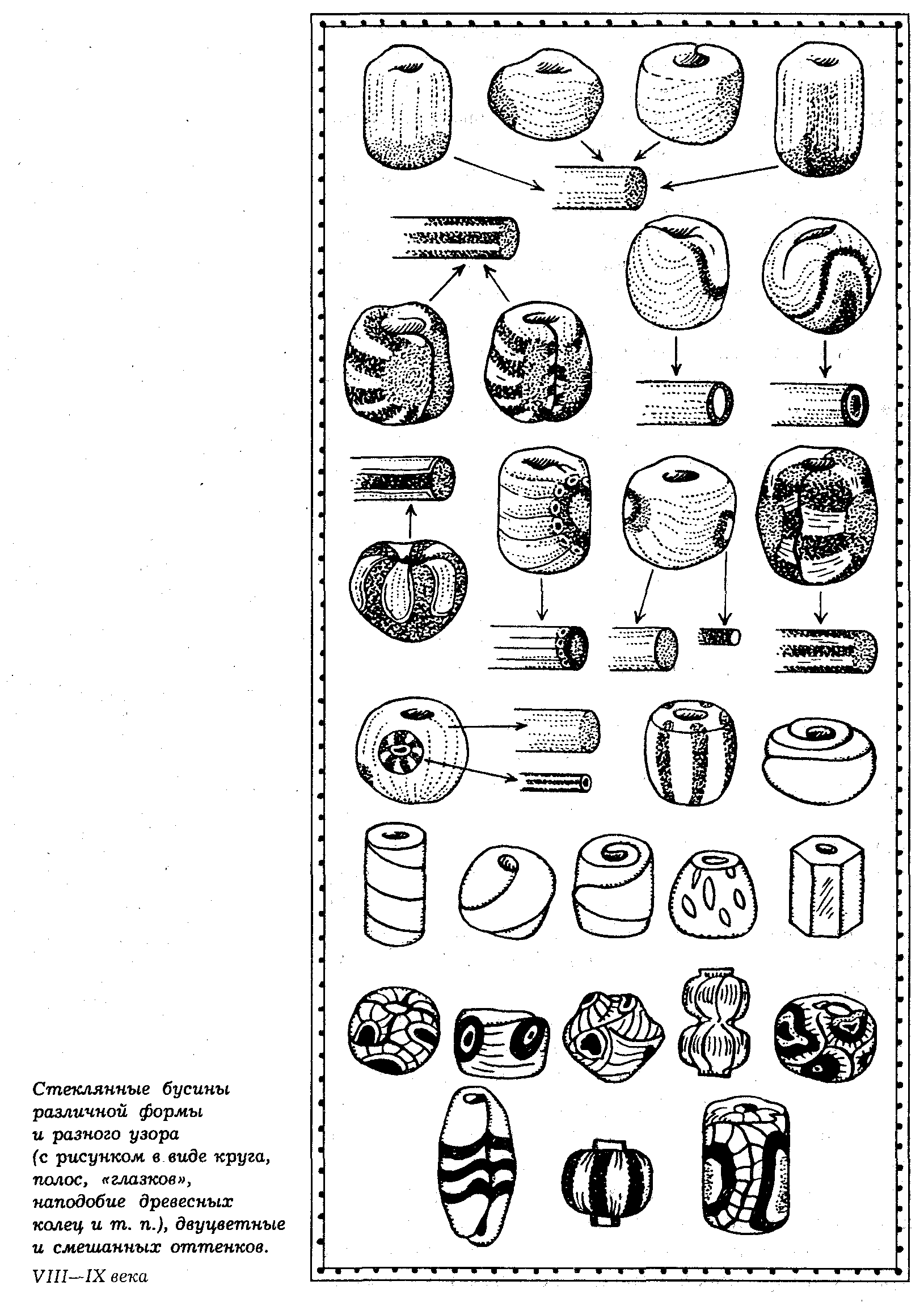Одни бусины попали на волховские берега из Средней Азии, другие с Северного Кавказа, третьи — из Сирии, четвёртые — вовсе с Африканского континента, из египетских мастерских. Самое интересное, что везли их сюда не восточным путём, через Русь, а, наоборот, по водным магистралям Западной Европы — через земли западных (Словакия, Моравия, Чехия) и балтийских славян, владевших выходами в море. Образцы таких бус найдены и в Скандинавских странах, в торговых центрах, известных в те времена по всему балтийскому «Средиземноморью»: в городах Хедебю и Бирке, на острове Готланд, Сюда везли бусы, продавали их друг другу и местному населению купцы — славянские, скандинавские и прочие. (Кстати, нельзя исключать, что бусы порой служили не только товаром, — но об этом чуть позже.) А начиная с IX века в этих городах кроме привозных бус находят и явно сделанные на месте...