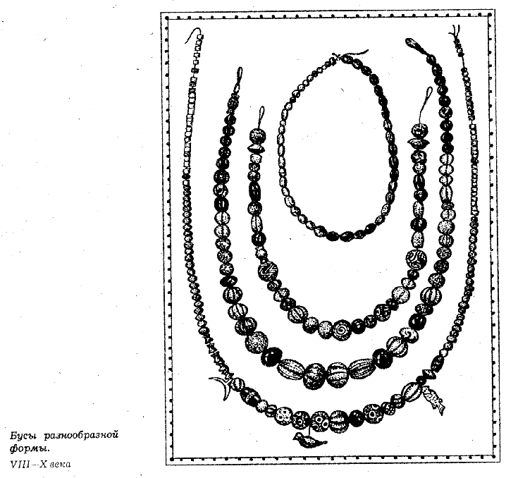 А ещё славяне очень любили бисер. Изготавливали его самых разных цветов: жёлтый (ярко-жёлтый и лимонный), зелёный, бирюзовый, васильковый, сероголубой, молочно-белый, розовый, красный. Арабские путешественники упоминают, что зелёные бусы (бисер) считались у славян весьма престижными и были признаком богатства. Попадается археологам и «позолоченный» бисер (в Рязано-Окском районе с начала нашей эры и по VIII век он был вообще основным видом бус). Учёные пишут, что делали бисер из стеклянных трубочек диаметром 5—7 мм: сперва намечали бисерины щипцами, потом отделяли острым лезвием. Затем помещали в горшок, перемешивали с золой или мелким песком и вновь нагревали. У части бисерин (у трёх-четырёх на каждую сотню) при этом заплывали отверстия, предназначенные для нити, но зато остальные делались гладкими и блестящими: хочешь — пришивай, хочешь — нанизывай на крепкую нитку и носи на здоровье!