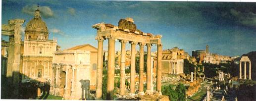 Город Рим, основанный 19 апреля 735 г. до н.э., вначале был скромным посёлком, но со временем он набирал всё большую силу и впитывал лучшие творческие веяния, шедшие со стороны. Главной святыней Рима являлся храм Юпитера, Юноны и Минервы на Капитолийском холме. Храм не сохранился, но учёные предполагают, что он был распланирован по этрусскому образцу: с глубоким передним портиком, высоким цоколем и лестницей, ведущей к главному входу.