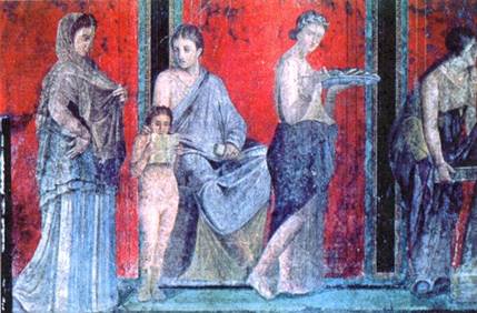 моде в течение I в. до н.э. Мастера второго помпейского стиля превращали интерьер в подобие городского пейзажа. Во всю высоту стен шли изображения колоннад, всевозможных портиков, фасадов зданий. В росписях появились и фигуры людей. В пампейской Вилле Мистерий, названной так по изображениям в одном её помещении загадочной сцены, имеется прекрасный пример подобной росписи. Ритуальная комната буквально насыщена «огнём»: на красных стенах в натуральный рост представлены фигуры участников дионисийского таинства. Архитектурные членения помогают упорядочить очень сложную сцену, ядром которой выступает миф о возрождении бога Диониса в браке с Ариадной (они изображены на центральной стене сидящими). На этом фоне разворачивается картина ритуального действа, в котором принимают участие вполне реальные люди. Начало и конец композиции обрамлены фигурами женщин. Одна стоит, обращаясь в глубь комнаты, другая задумчиво, с иронией наблюдает за происходящим. Возможно, весь мистериальный эффект был рассчитан на хозяйку дома — новобрачную, поскольку у обеих фигур (одна и та же женщина в двух ипостасях) на пальце изображено обручальное кольцо.