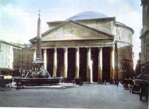 Снаружи он представляет собой огромный цилиндрический объём, к которому пристроен глубокий портик. Прежде в Пантеон входили через стоявшую на его площади триумфальную арку. Она была символическим знаком приобщения к божественному. Внутри же Пантеон совсем иной. Он имеет двухъярусную стену с колоннами и нишами, прорезанную сводчатыми арками. На втором, меньшем и более плоском ярусе стоит купол. Его мощь зрительно облегчают пять рядов перспективных кессонов (квадратных углублений) и верхний проём диаметром девять метров. Покой, внутреннюю гармонию, уход от земной суеты в мир духовности — вот что давал Пантеон посетителям.