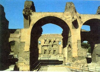 простые и такие шедевры архитектуры, как у Каракаллы, — были разбросаны по всей империи В каждом провинциальном городе были свои бани. Термы Каракаллы занимали колоссальную площадь с газонами, имели залы горячей, тёплой и холодной воды (калдарий, тепидарий, фригидарий). Они представляли собой сложные архитектурные сооружения, перекрытые сводами разных конструкций — высшее достижение инженерного гения. Их руины до сих пор поражают величием. А современники Каракаллы могли любоваться и блеском полудрагоценных камней, и позолотой, и мозаикой, и богатым декором, покрывавшим стены и своды терм.