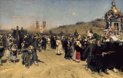 «Крестный ход в Курской губернии» (1880-1883) (приложение № 5). Тема крестного хода - одна из популярнейших в русской живописи. Однако Репин не имеет соперников в изображении толпы, шествия. В «Крестном ходе» толпа показана как единый массив. Но когда взгляд начинает выхватывать отдельные фигуры, создается впечатление, что Репин буквально каждое лицо увидел в жизни.