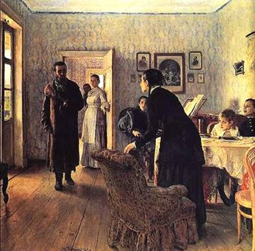 Самым значительным произведением на революционную тематику стало полотно «Не ждали» (приложение № 6 ). Художник изобразил революционера, возвратившегося в родной дом из ссылки. Его неловкая поза, ожидание, застывшее в глазах, свидетельствующих о неуверенности, даже страхе: узнает ли его семья, примут ли отца, отсутствующего много лет, его дети? Репину удалось мастерски передать всю сложную гамму чувств, отраженных на лицах революционера и членов его семьи. Испуганно смотрит на незнакомого мужчину девочка (когда его забрали, она была слишком мала и потому забыла своего отца), изумлением полны глаза жены, сидящей у рояля. А на лице мальчика - радостная улыбка, говорящая о том, что ребенок догадался, кто стоит перед ним.