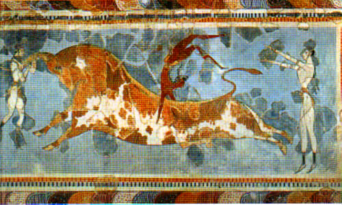 Фреска с таврокатапсией показывает, насколько динамичным и живым было минойское искусство. Ему были чужды застывшие позы, остановившиеся взгляды, самоуглублённость – всё, что было так дорого египтянам и обитателям древнего Двуречья (Месопотамии). Для критян был важен момент, верно схваченное действо, трепет настоящего. Вот юноша делает сальто над спиной быка, вот бык уже пронзил рогами одну противницу... Пусть громадный – он массивнее всех борцов, вместе взятых, – бык тем не менее обречён. Он летит в пространстве, отрываясь от земли, но борцы проворнее, ловчее: они успевают одолеть бога-быка до того, как им нанесены смертельные раны.