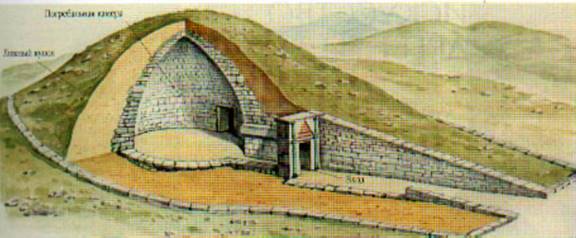 Купольные гробницы небольшого размера, предназначенные для захоронения членов целых родов, известны на Крите. Но такой тип богатого погребального сооружения с длинным дромосом (около тридцати шести метров) в Эгеиде и на Балканах прежде не встречался. Он появится в Северном Причерноморье в V в. до н. э. Царский курган под Керчью является прямым наследником микенского толоса.