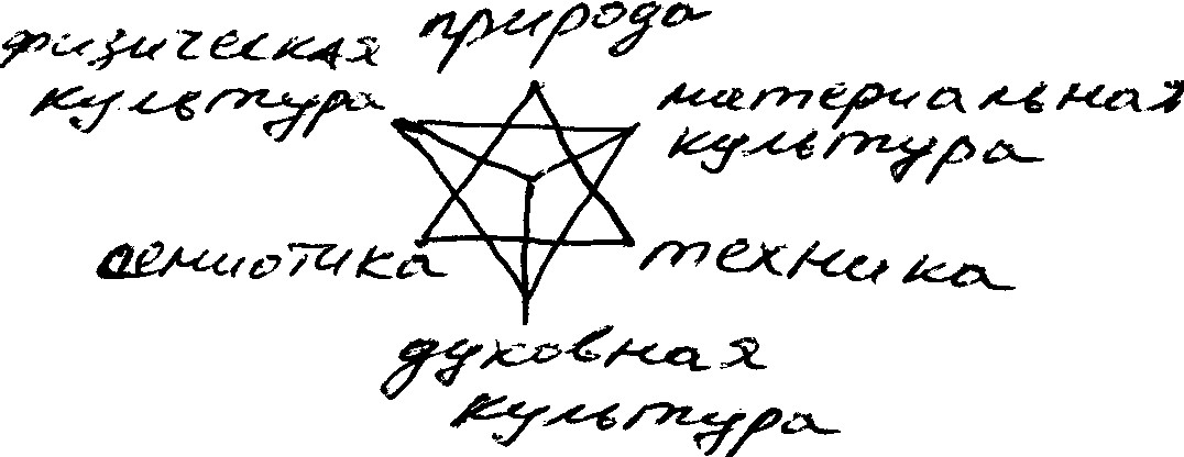 Если общество есть единство природы, семиотики и техники, реализуемое в деятельности людей, и культура составляет историческую память этой деятельности, то память соединяет вершины этого треугольника. Рост культуры представляют как векторы, изображающие развитие трёх основных форм культуры. Движение по этим векторам составляет рост культуры (Рождественский Ю.В., Введение в культуроведение, М.: 1996 – 11с.).
