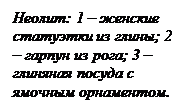 В эпоху неолита и бронзовый век подлинный рассвет пережил орнамент, появились изображения. Передающие более сложные и отвлеченные понятия. Сформировались многие виды декоративно-прикладного искусства – керамика, обработка металла. Появились луки, стрелы и глиняная посуда. На территории нашей страны первые металлические изделия появились около 9 тыс. лет назад. Они были кованные – литье появилось гораздо позднее.