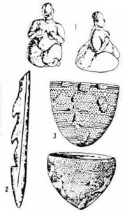 Культура в эпоху мезолита и неолита. Более поздние этапы развития первобытной культуры относятся к мезолиту, неолиту и ко времени распространения первых металлических орудий. От присвоения готовых продуктов природы первобытный человек постепенно переходит к более сложным формам труда, наряду с охотой и рыболовством начинает заниматься земледелием и скотоводством. В новом каменном веке появился первый искусственный материал, изобретенный человеком, - огнеупорная глина . Прежде люди использовали то, что давала природа, - камень, дерево, кость. Земледельцы гораздо реже, чем охотники, изображали животных, зато с увеличением украшали поверхность глиняных сосудов.