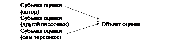 Объектом оценки является персонаж, оцениваемый со стороны разных субъектов: автора и персонажей (союзник, противник, самооценивающий субъект).