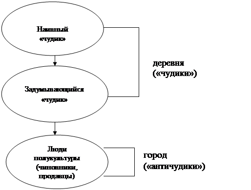 Неприятен и жалок Шукшину тип «античудика». В их поведении, характере заметна «сдвинутость». Только сдвинуты эти люди совсем в другую, дурную сторону. «Античудики» – непревзойдённые мастера творить зло, пусть мелкое, пусть бессмысленное, бьющее прежде всего по ним же. Творят они его с истинно творческим азартом, артистически, с упоением…