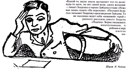 “Какой-то закон земли заставляет что-то делать, куда-то идти, но нет своей воли, своих желаний”, — пишет Зощенко о героях Зайцева в главе “Неживые люди” книги “На переломе”. “Поэзией безволья” называет Зощенко произведения Зайцева. Так же пассивно ведет себя “неживой” герой из раннего рассказа самого Зощенко “Подлец”. Борис оказывается многословным, но робким и нерешитель ным”