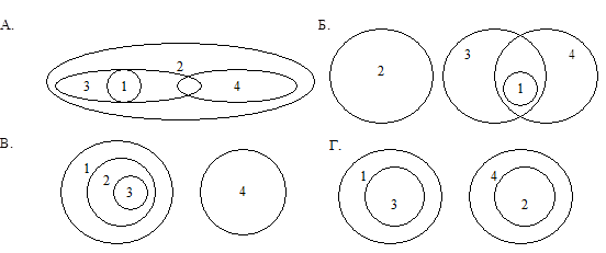 210) Выберите правильный ответ к задаче и объясните её решение: соотношение объемов понятий «1. равносторонний треугольник, 2. Бермудский треугольник, 3. остроугольный треугольник; 4. равнобедренный треугольник» отражено на схеме.
