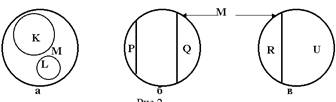 К несовместимым понятиям (обозначены K и L ) относятся соподчиненные родовому понятию M (рис. а), противоположные (рис. б) и находящиеся в отношении противоречия, противоречивые (рис. в).