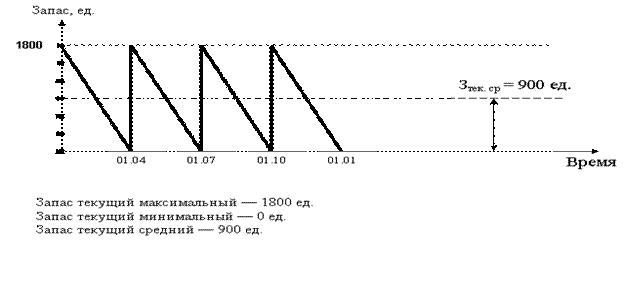Рассмотрим порядок определения оптимального размера текущего запаса товара одной номенклатуры. Природа текущего запаса отражена в его названии: «текущий». Действительно, обеспечивая бесперебойное функционирование торгового или производственного предприятия в периоды между очередными поставками, эта категория запаса как бы «вытекает» со склада, изменяя свое значение при каждом расходе. Говоря о размере текущего запаса, как правило, говорят о его максимальной, средней или минимальной величине. В случае если новая партия расходуемого товара прибывает точно в момент окончания предыдущей, минимальная величина текущего запаса будет равна нулю (не общего, а текущего!), а средняя величина — половине максимальной. Очевидно, что при таком режиме поставок максимальный текущий запас будет равен размеру поставленной партии товара. На рис. 1 показано, как в течение четырех кварталов (ось ОХ) по мере расхода и поставки размер текущего запаса (ось OY) меняется от 1800 до 0 единиц.