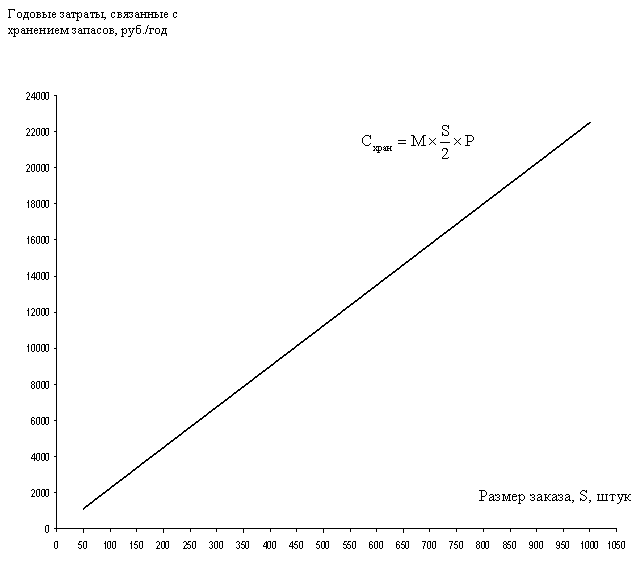 В системах управления запасами в качестве единицы измерения времени при определении удельных затрат на хранение чаще всего принимают год. Таким образом, величина М показывает, какую часть от стоимости единицы продукции составляет стоимость ее хранения в течение года. Например, если закупочная стоимость изделия составляет 600 руб., а М = 0,3×1/год, то это означает, что хранение одного изделия в течение года обходится предприятию в 180 руб.